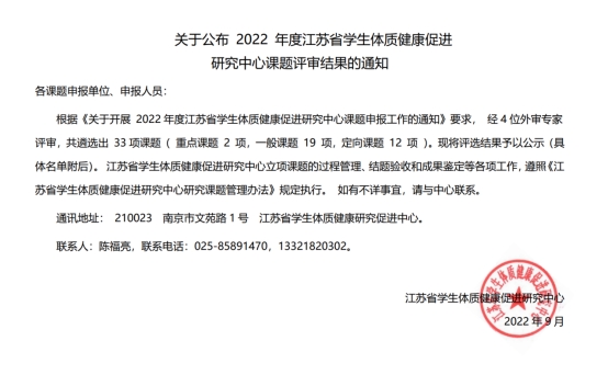 体育部获批1 项2022年度江苏省教育厅学生体质健康促进研究中心课题
