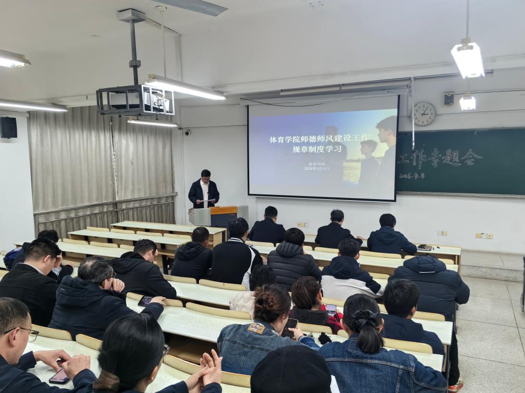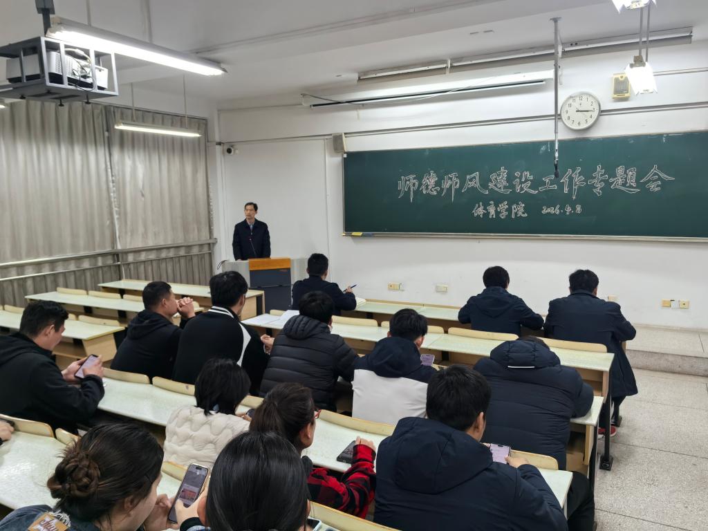 2026年4月8日下午,体育学院在2204教室召开师德师风建设工作专题会。会议由党总支委员、副院长刘青主持,学院全体教职工参会。